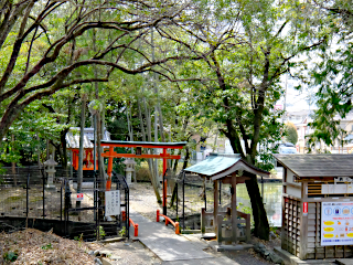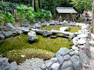 入り口横にコンクリートで囲まれた池があり、その中の島に厳島神社が見える。