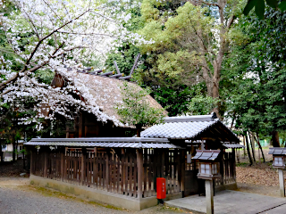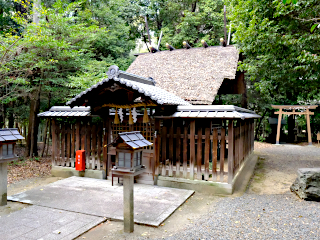 萱葺きの神明造で外削の千木、奇数の鰹木などが見られる。
