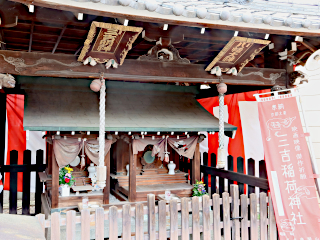 その2年後に日活が撮影所を建設した際に竹藪に三吉稲荷と中里八幡宮があり、これを合祀して移転したのが今回ご紹介する三吉稲荷神社である。この神社は大映通の中間部分にある。