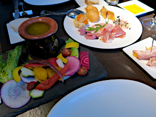 写真はアラカルトメニューでディナーの様子。手前のバーニャカウダは熱したディップソースを西村農園の旬野菜に浸して食べるのだが非常にうまい。料理は日本の素材を本格的なイタリアンにアレンジしており美味しい。