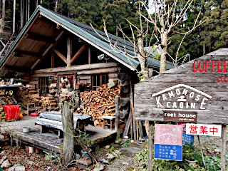 旧京北町の北部、周山街道(国道162号線)が西に折れ曲がるカーブ沿いに大きなログハウスが見える。カモノセキャビンという名のカフェである。