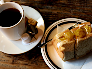 写真は手作りの栗シフォンケーキとホットコーヒー。ケーキは甘さ控えめでしっとりとして美味しい。常連客も多いが、数十年ぶりにはるばる訪れる人もいる。いつまでも営業して欲しいものだ。