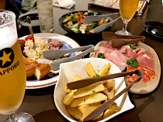 コース料理を予約をしていったので、着席すると手際良く前菜やサラダ、生ハムに皮付きポテトなどがテーブルを埋める。食べるとどれも美味しく丁寧に作られていることが感じられる。